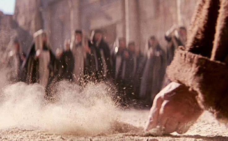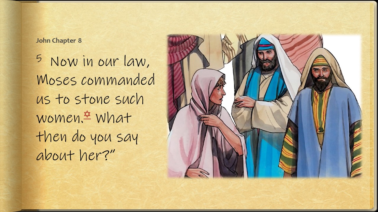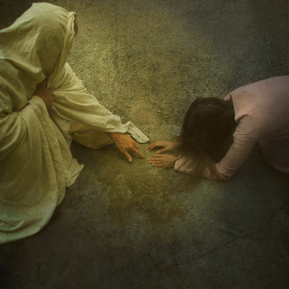 “他们还是不住地问他,耶稣就直起腰来,对他们说,‘你们中间谁是没有罪的,谁就可以先拿石头打她。’于是又弯着腰用指头在地上画字。”(约翰福音8:7–8)