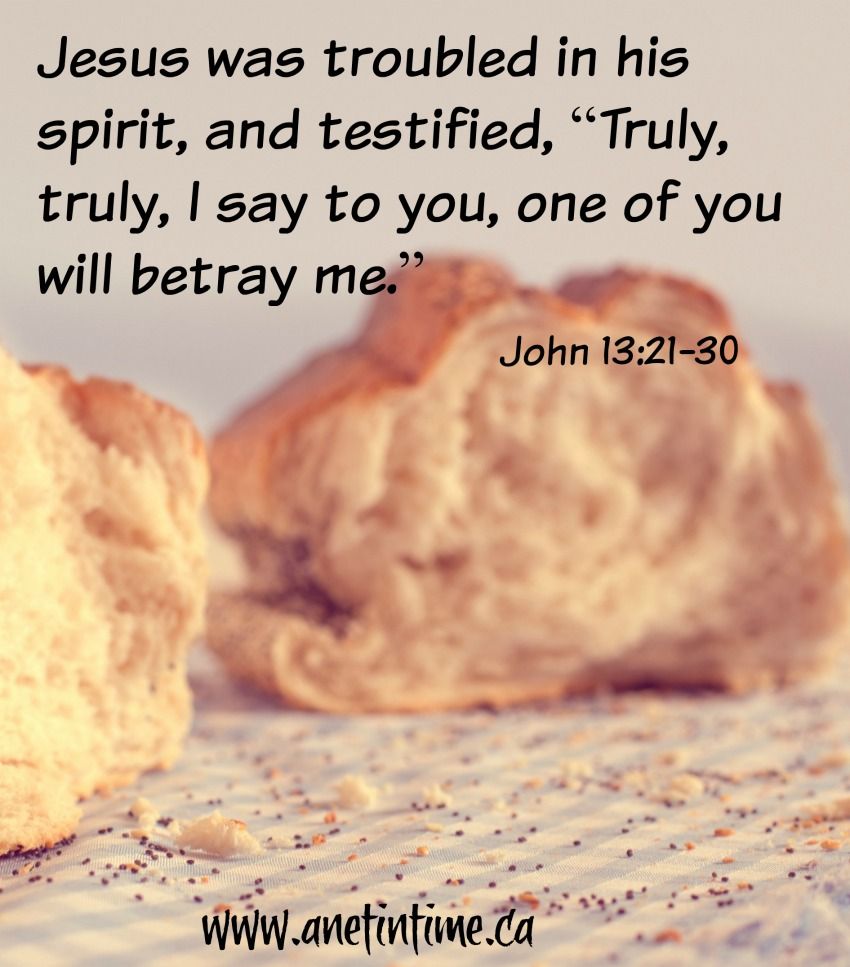 “耶稣说了这话,心里忧愁,就明说,我实实在在地告诉你们,你们中间有一个人要卖我了。”(约13:21)
