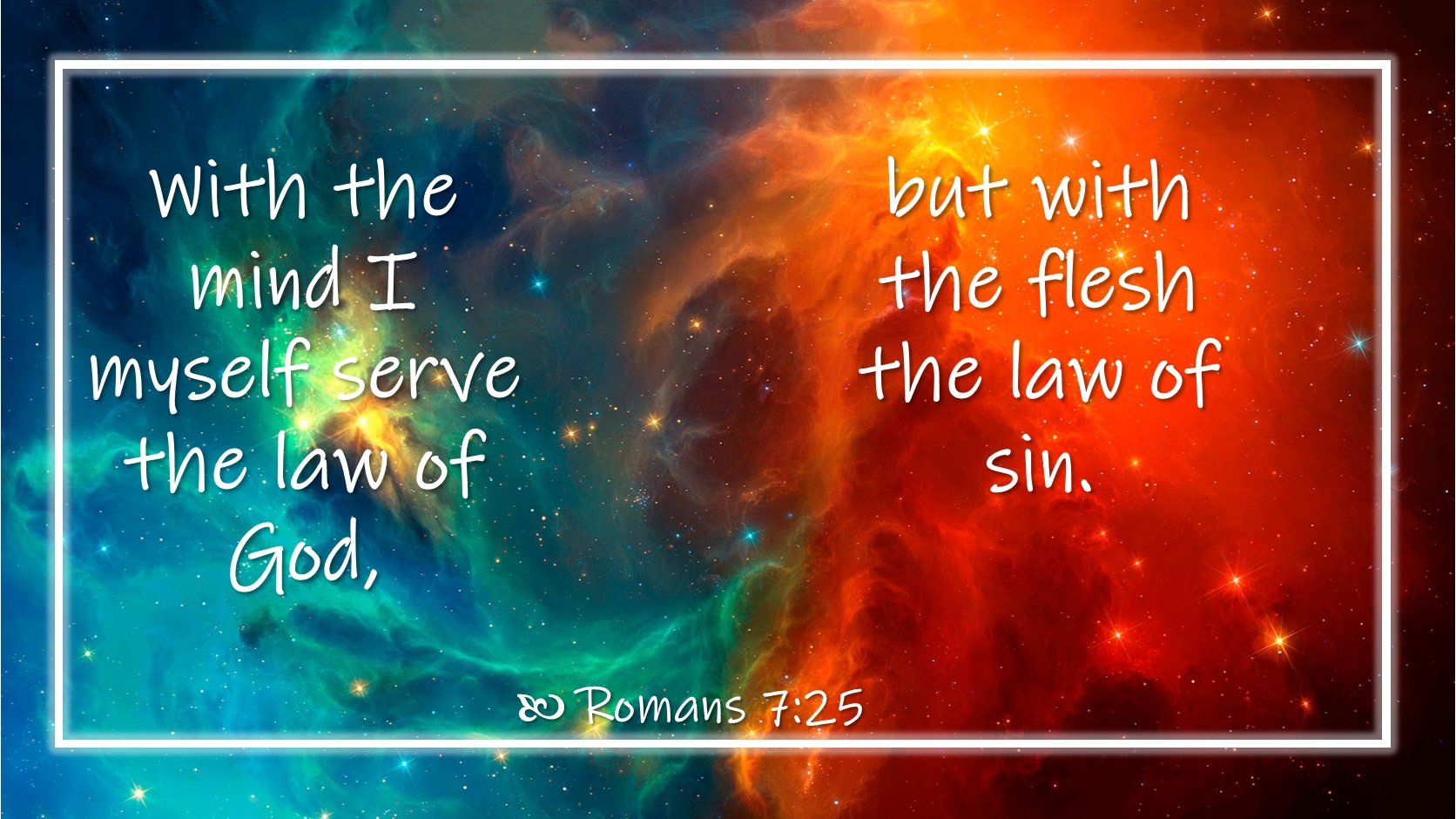 我们的内心是要顺服神的律,我们肉体却顺服罪的律;因此,我们里头有两个律的交战。这二个律的交战如同拉锯战,不是速战速决,而是长时期的交战。人越随从肉体,肉体的力量就越强大,灵里的力量就越微弱。人若能对付肉体,不随从肉体的意愿,不求肉体的满意,他肉体的力量就会衰微下去。这是消极方面的。积极方面,我们要多祷告,多安静亲近神,神能借着祂的灵使我们心里的力量刚强起来。我们要全心全意倚靠神,仰望神的拯救。保罗经过了二个律的交战,他深感自已无能为力,力不能胜。他说:“我真苦阿!谁能救我脱离这取死的身体呢?”“取死的身体”可更确切地译作“该死的己生命”。保罗深知己生命是该死的,却死不了,因着他在那里叫苦求救,神借着赐生命和圣灵的律,救他脱离了罪和死的律。