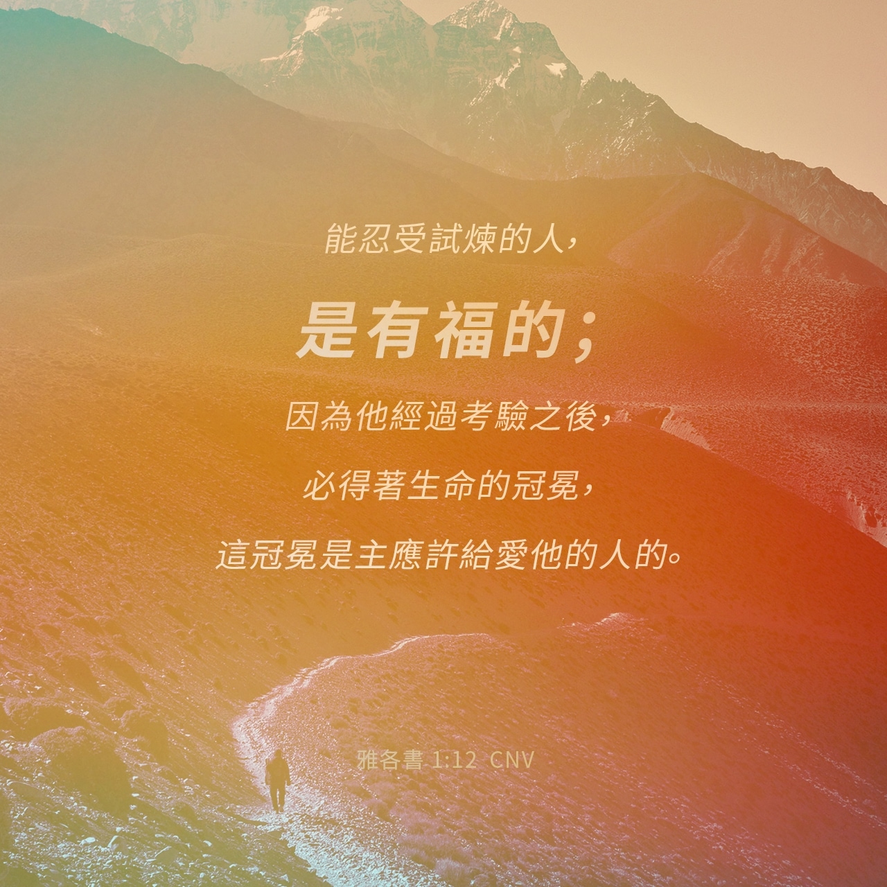 祷告:亲爱的主,我们知道经历百般的试炼是你给我们的命定。我们求你帮助我们成为能够“忍受试炼的人”,叫我们因此蒙福,并得着生命的冠冕。荣耀归主。奉基督的名,阿们!