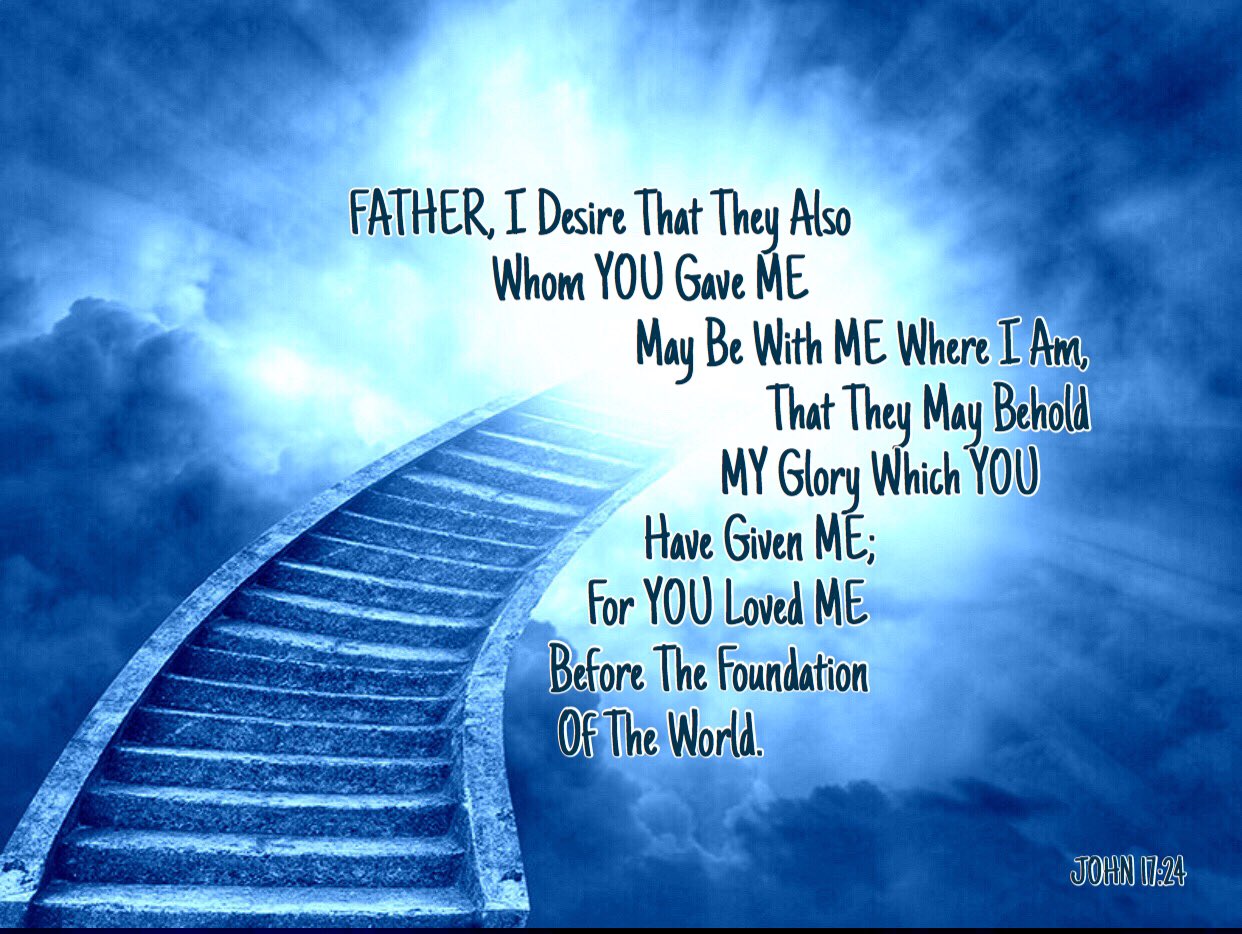 “我在他们里面,你在我里面,使他们完完全全的合而为一。叫世人知道你差了我来,也知道你爱他们如同爱我一样。父啊,我在哪里,愿你所赐给我的人也同我在哪里,叫他们看见你所赐给我的荣耀。因为创立世界以前,你已经爱我了。”(约17:23–24)