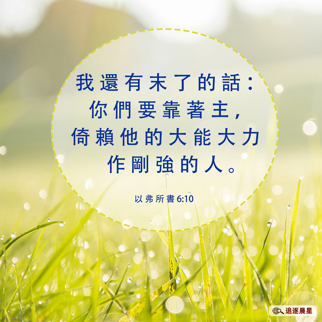 今日经文:“我还有末了的话,你们要靠着主,倚赖祂的大能大力,作刚强的人。要穿戴神所赐的全副军装,就能抵挡魔鬼的诡计。因我们并不是与属血气的争战,乃是与那些执政的,掌权的,管辖这幽暗世界的,以及天空属灵气的恶魔争战。(两争战原文都作摔跤)所以要拿起神所赐的全副军装,好在磨难的日子,抵挡仇敌,并且成就了一切,还能站立得住。所以要站稳了,用真理当作带子束腰,用公义当作护心镜遮胸。又用平安的福音,当作预备走路的鞋穿在脚上,此外又拿着信德当作藤牌,可以灭尽那恶者一切的火箭。并戴上救恩的头盔,拿着圣灵的宝剑,就是神的道。靠着圣灵,随时多方祷告祈求,并要在此儆醒不倦,为众圣徒祈求。”(以弗所书6:11–18)
