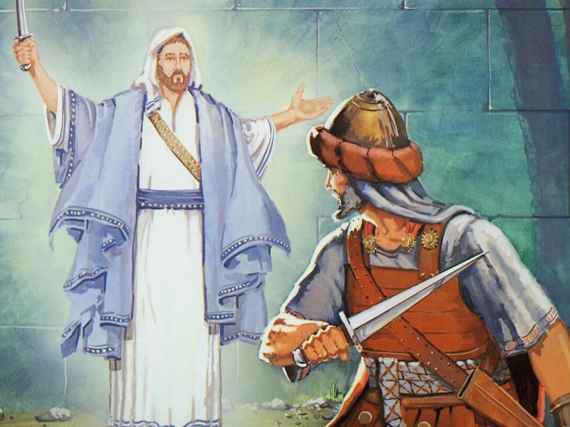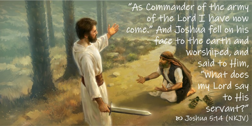 “约书亚靠近耶利哥的时候,举目观看,不料,有一个人手里有拔出来的刀,对面站立。约书亚到他那里,问他说:你是帮助我们呢,是帮助我们敌人呢?他回答说:不是的,我来是要作耶和华军队的元帅。约书亚就俯伏在地下拜,说:我主有什么话吩咐仆人。”(5:13–14)