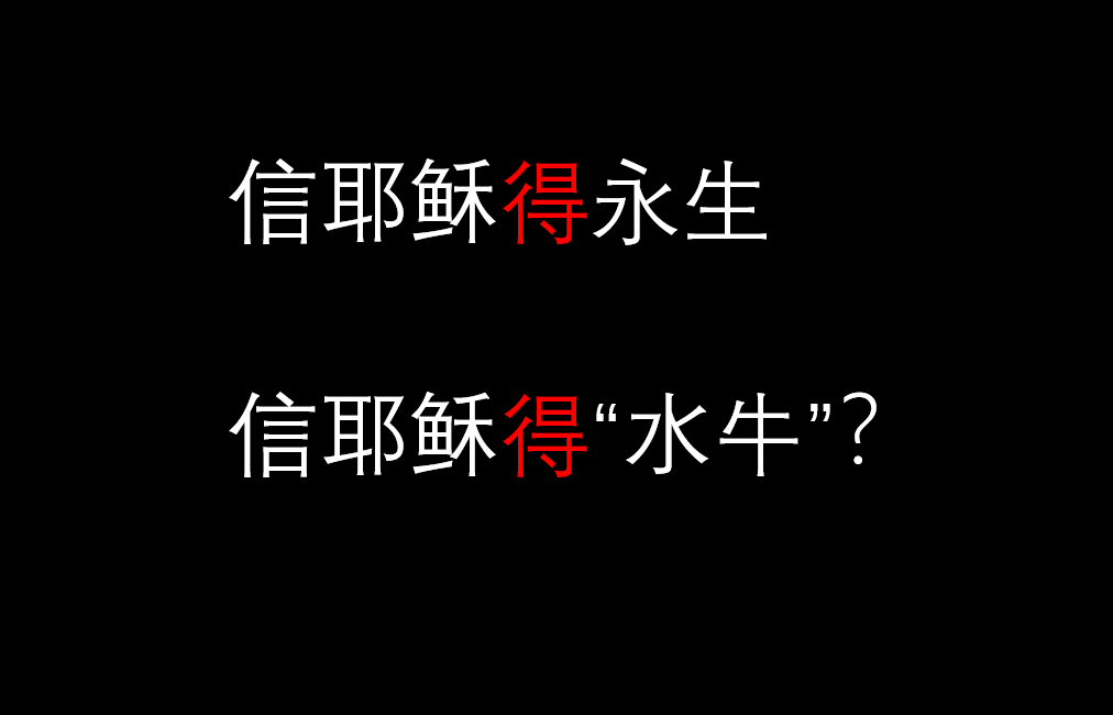 “永生”变“水牛”听起来好笑,可今天我却笑不出来,因为曾经的“永生”今天对很多人来说,已经变成了“水牛”,不是因为油漆脱落,不是因为大风刮跑,不是因为孩子调皮,而是教会明明白白传的就是“信耶稣得水牛”,而忽略了信耶稣真正的目的“得永生”: