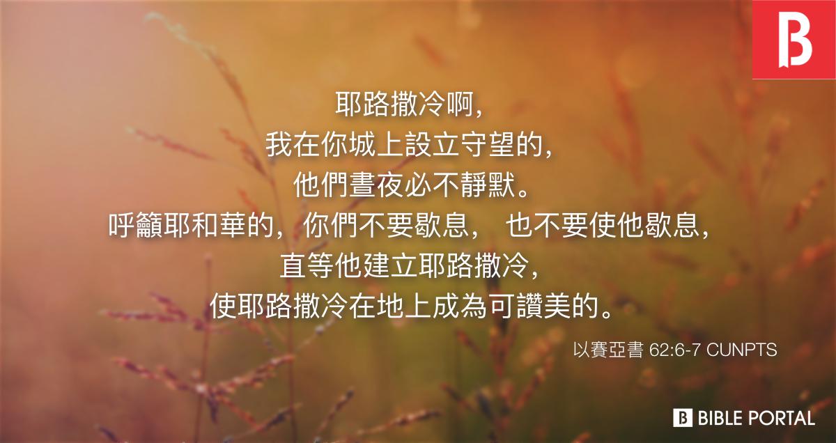 “耶路撒冷啊,我在你城上设立守望的。他们昼夜必不静默。呼吁耶和华的,你们不要歇息,也不要使祂歇息,直等祂建立耶路撒冷,使耶路撒冷在地上成为可赞美的。”(赛62:6–7)