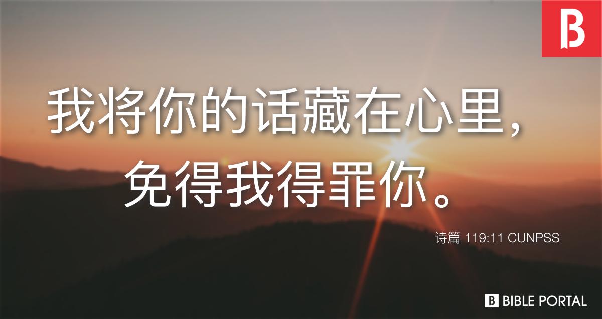 9少年人用什么洁净他的行为呢?是要遵行你的话。10我一心寻求了你。求你不要叫我偏离你的命令。11我将你的话藏在心里,免得我得罪你。12耶和华阿,你是应当称颂的。求你将你的律例教训我。13我用嘴唇传扬你口中的一切典章。14我喜悦你的法度,如同喜悦一切的财物。15我要默想你的训词,看重你的道路。16我要在你的律例中自乐。我不忘记你的话。