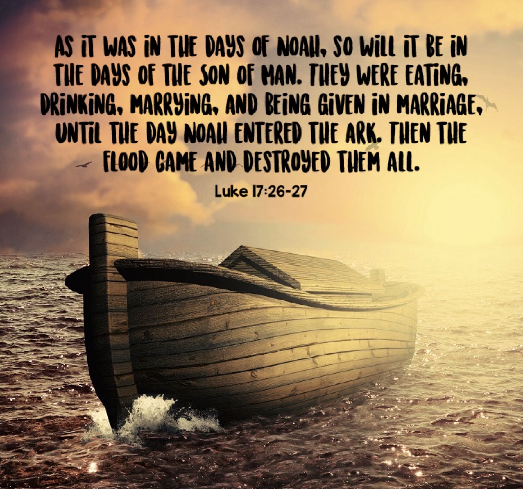 注意,主耶稣此处只是提到人们在“挪亚的日子”里的正常生活——“又吃又喝,又娶又嫁”,“又吃又喝,又买又卖,又耕种,又盖造”。27节中的“吃”、“喝”、“娶”、“嫁”,都是过去未完成式,表明在过去持续发生的动作。但“进”、“来”和“灭”,却都是过去不定式,表明在人们“又吃又喝,又娶又嫁”的时候,挪亚进了方舟,洪水就来了,把他们全都灭了。