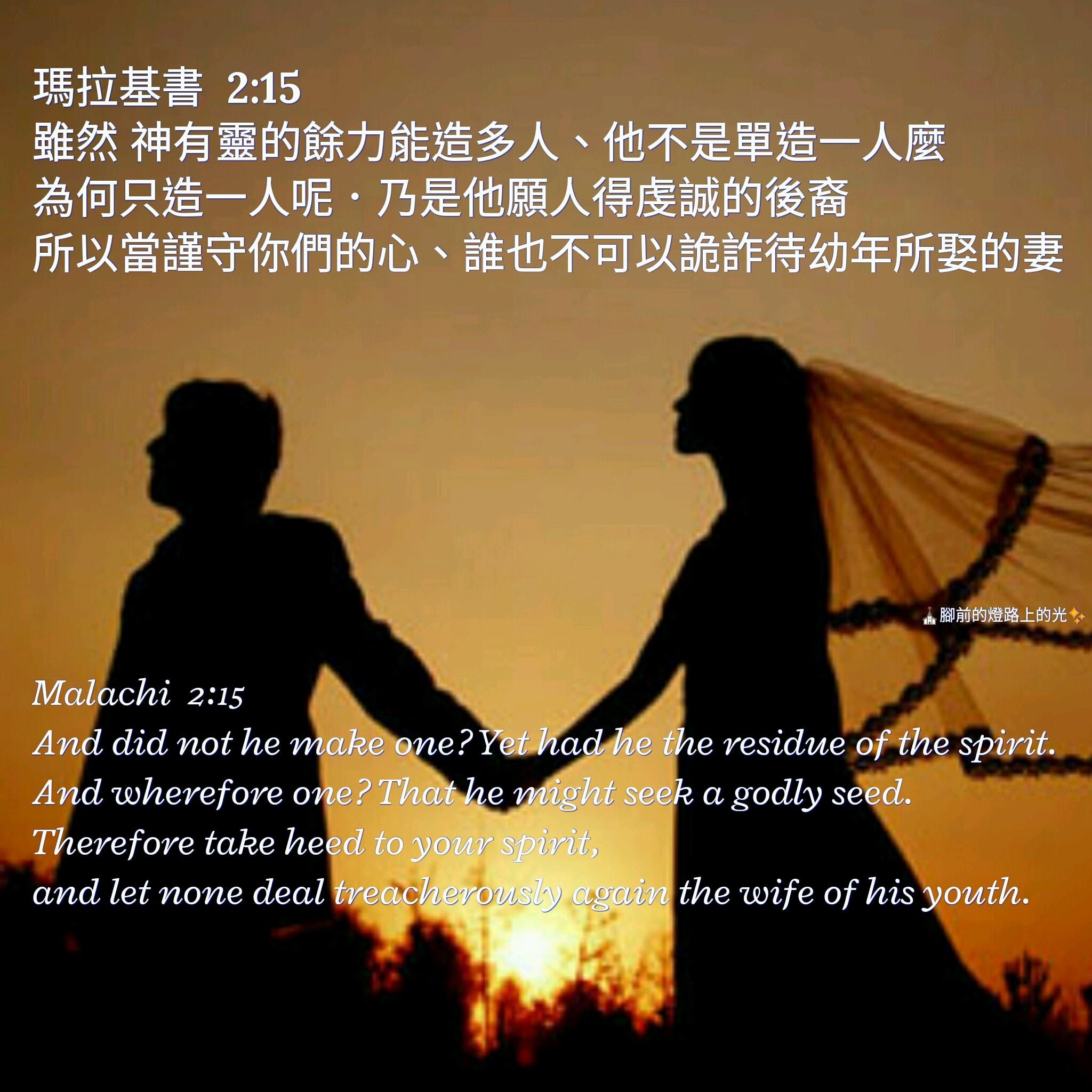 上帝的目的是使人借着婚姻,灵与灵,肉与肉的结合得以产生敬虔的后裔。所以破坏婚姻就是破坏上帝造人的计划。因此先知严厉的警告,当谨守你们的心,谁也不可以诡诈待幼年所娶的妻。耶和华以色列的神说,休妻的事和强暴待妻的人都是我所恨恶的,所以当谨守你们的心不可行诡诈,这是万军之耶和华说的。