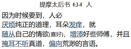 第一、厌烦纯正的道理,耳朵发痒;通常有头发异物或是小飞虫跑进人的耳朵,人感觉发痒不舒服,难以忍受时就会想办法清除;当他在清理耳朵的时候,别的声音或是别人对他讲话,他是听不进大脑的。末后的日子里,当人厌烦圣经福音真理的时候,他不想听但不正面的回绝,而是会做出一个耳朵发痒的反应动作,表示他根本不愿意纯正的道理进入他的头脑里。这种消极的反应其实就是一种借口,正如在路加福音14:16–20耶稣对律法师和法利赛人说了一个神国宴席邀请客人出席的比喻,主人派仆人出去邀请已经受邀的客人来坐席,结果他们都有借口推辞,不是买地看地、买牛试牛,就是刚才娶妻不能参加。他们拒绝了,当然也就得不到神所赐的福分。