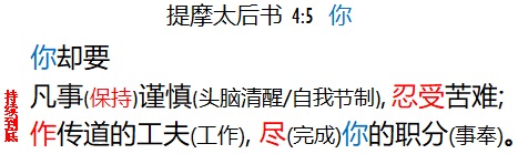 提摩太生活在那样异教邪说充斥的世界,面对许多厌烦福音抵挡基督的人,又要牧养以弗所教会,压力是很大的。保罗给他两个方面的建议,每方面都是用两个连续的动词来描述,这个连续是持续到底的意思,第一方面是保持谨慎和长久忍耐,第二方面是传道和尽职: