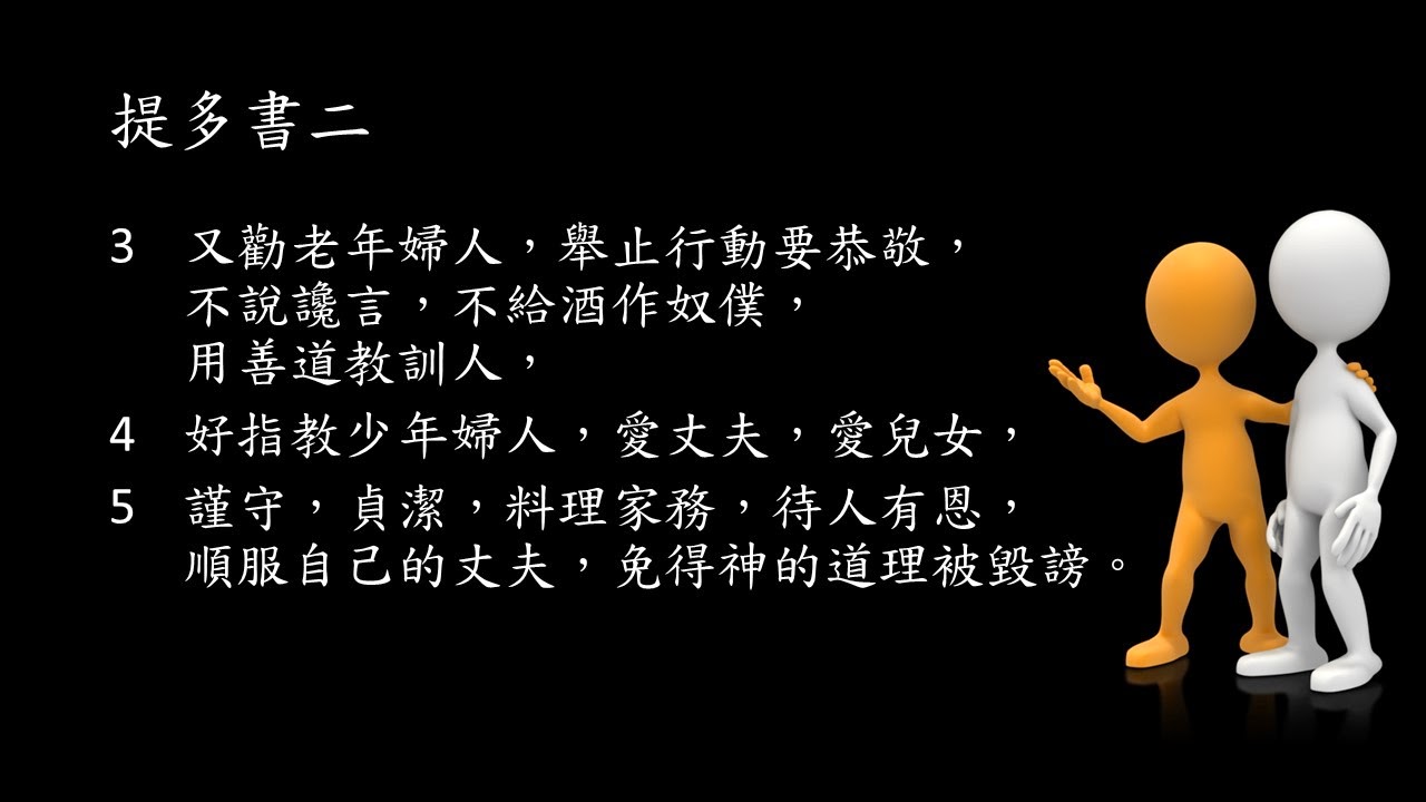 “又劝老年妇人,举止行动要恭敬,不说谗言,不给酒作奴仆,用善道教训人,好指教少年妇人,爱丈夫,爱儿女,谨守,贞洁,料理家务,待人有恩,顺服自己的丈夫,免得神的道理被毁谤。”(2:3–5)