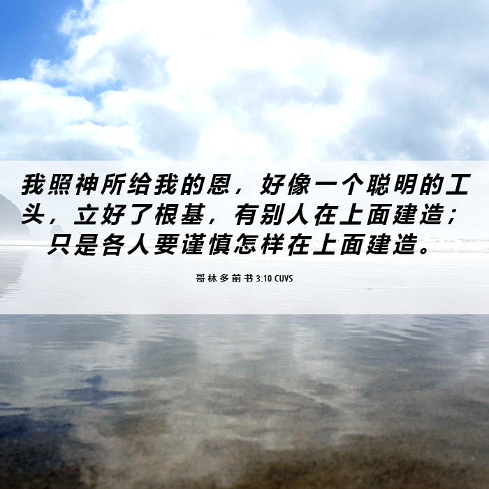 哥林多前书3:10,“我照神所给我的恩,好像一个聪明的工头,立好了根基,有别人在上面建造,只是各人要谨慎怎样在上面建造。”