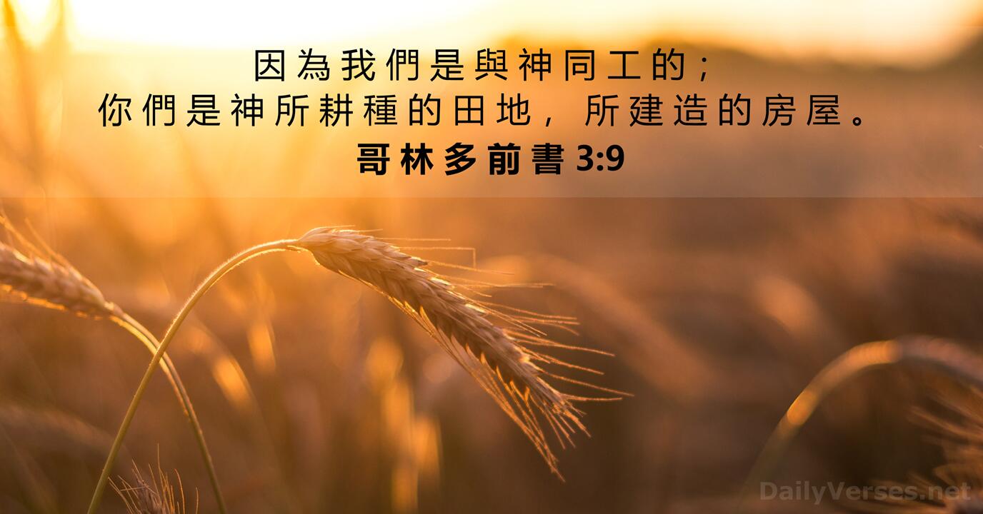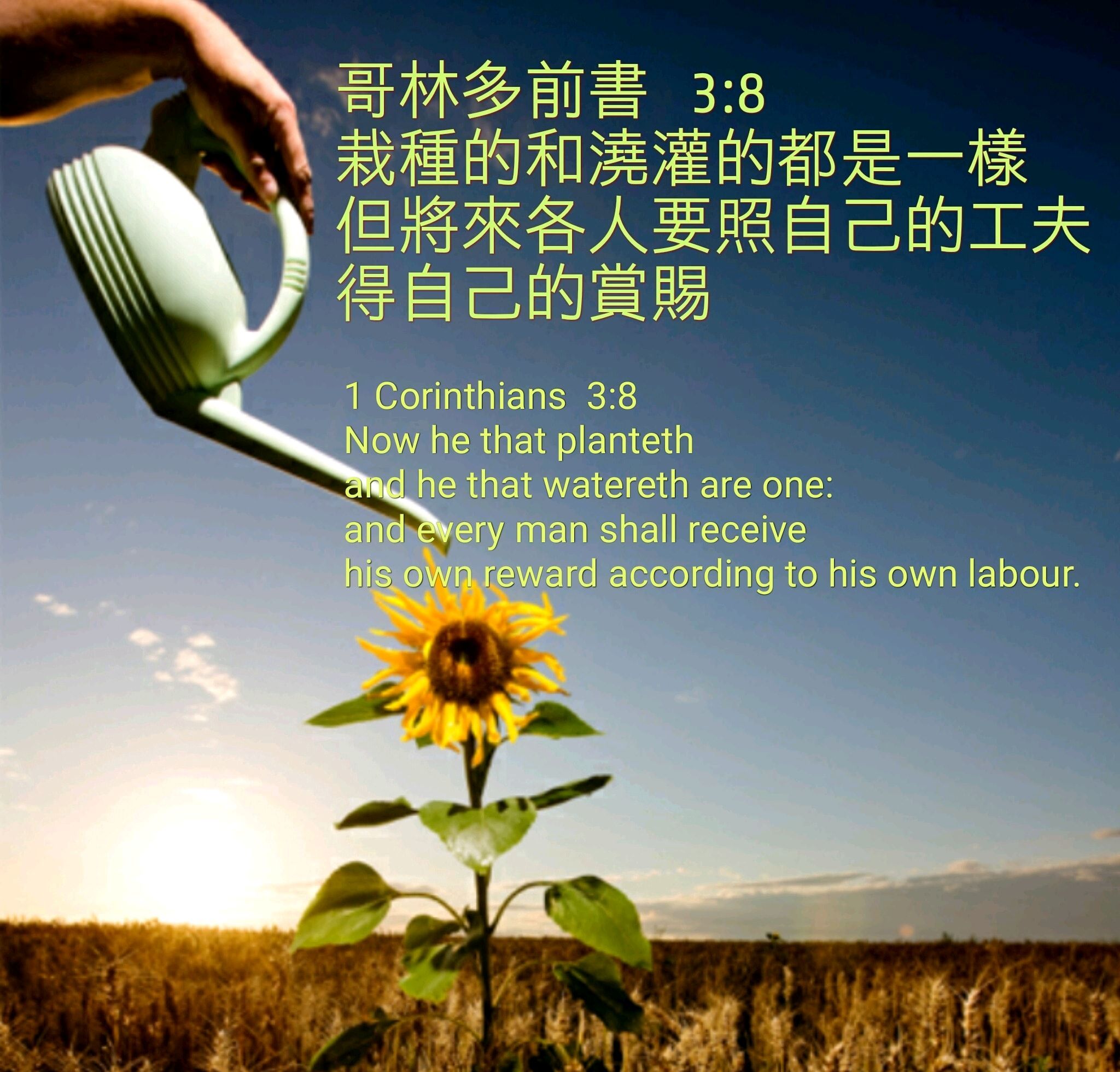 8栽种的和浇灌的,都是一样。但将来各人要照自己的工夫得自己的赏赐。9因为我们是与神同工的;你们是神所耕种的田地,所建造的房屋。10我照神所给我的恩,好像一个聪明的工头,立好了根基,有别人在上面建造,只是各人要谨慎怎样在上面建造。