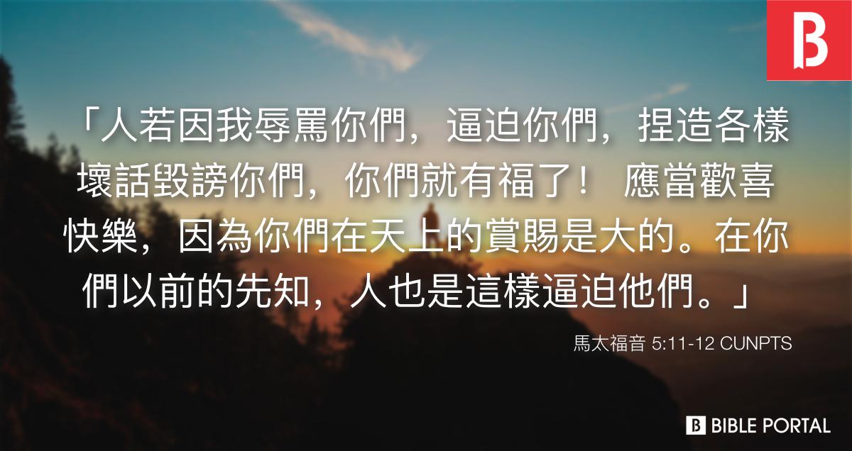 那复活得国、坐宝座的耶稣说:“人若因我辱骂你们,逼迫你们,捏造各样坏话毁谤你们,你们就有福了!应当欢喜快乐,因为你们在天上的赏赐是大的。在你们以前的先知,人也是这样逼迫他们。”(太5:11–12)