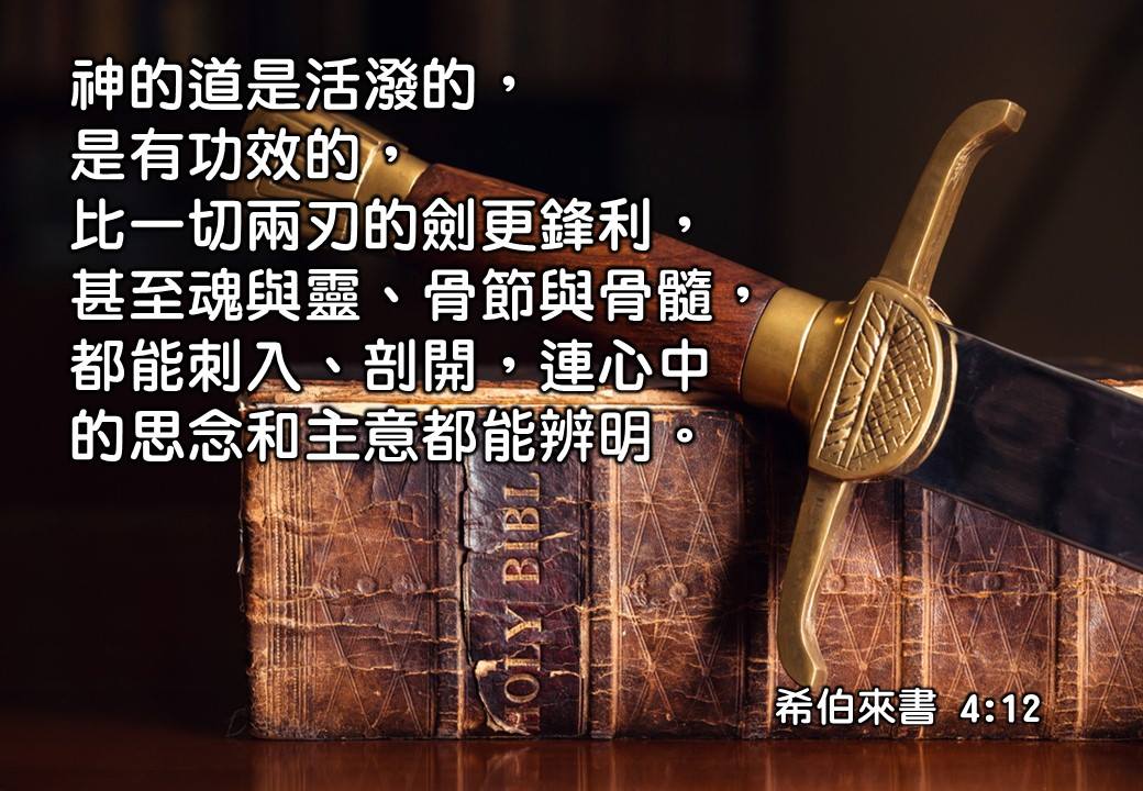 “神的道是活泼的,是有功效的,比一切两刃的剑更快,甚至魂与灵,骨节与骨髓,都能刺入、剖开,连心中的思念和主意都能辨明。并且被造的没有一样在祂面前不显然的;原来万物在那与我们有关系的主眼前,都是赤露敞开的。”(希伯来书4:12–13)