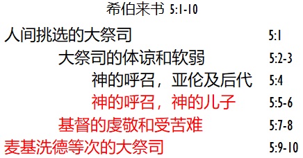 第1节人间挑选的大祭司奉派替人办理属神的事情,对应到9–10节麦基洗德等次的大祭司成了永远得救的根源。2–3节讲人间大祭司的所是、所为和不完全,对比到7–8节基督虔敬受苦顺从所成就的完全救赎。第4–6节强调大祭司都是经过神的呼召,人间的大祭司是亚伦及他的后代,对比永远的大祭司是神的儿子。从这个经文架构的展现,我们很清楚地看见所要强调的重点就是5–10节的部分。