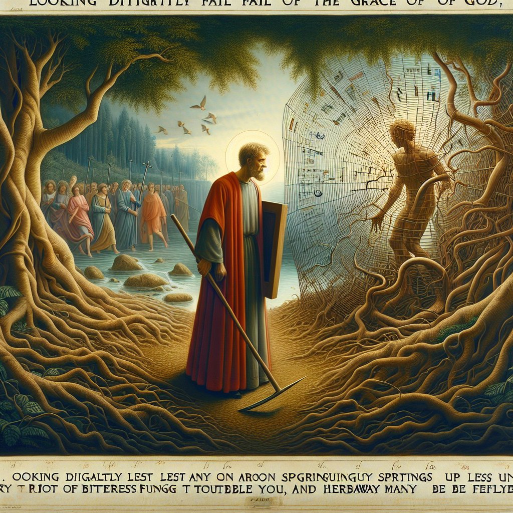 15又要谨慎,恐怕有人失了神的恩。恐怕有毒根生出来扰乱你们,因此叫众人沾染污秽。