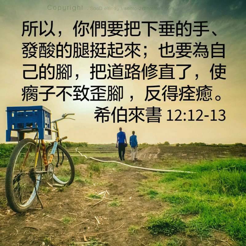 12所以你们要把下垂的手,发酸的腿,挺起来。13也要为自己的脚把道路修直了,使瘸子不至歪脚,反得痊愈(歪脚或作差路)。