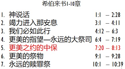 7:20–28就是第八、第九、第十,这三章经文的引言,第八章说明更美之约的由来,为何要取代旧约。第九章说明更美之约的中保大祭司,在天上真帐幕里所献的赎罪祭是什么。第十章宣告旧约献祭礼仪已经走入历史,说明更美之约中永远的赎罪祭之功效以及对我们的影响。现在我们来看7:20–28这个架构的内容。