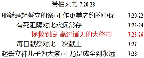 20–22节对称到28节都强调耶稣为祭司是神起誓立的,是更美的,是成全到永远的;23–24节及27节各有一个对比,“死亡阻隔和永远长存的对比”;“每日献祭和一次献祭的对比”,要说明律法所立人间大祭司和永远大祭司的差别;凸显出中间25–26节的中心信息,讲到这位高过诸天的大祭司,更美之约的中保要如何拯救我们这些罪人,让我们可以进到神的面前。