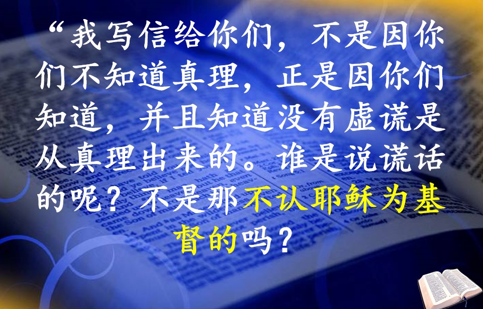 老约翰这样说:“我写信给你们,不是因你们不知道真理,正是因你们知道,并且知道没有虚谎是从真理出来的。谁是说谎话的呢?不是那不认耶稣为基督的吗?不认父与子的,这就是敌基督的。凡不认子的,就没有父;认子的,连父也有了。”(约壹2:21–23)你看,说得非常清楚了。不认父神与神子的,就是敌基督的。感谢主,我们既认父神,也认子。