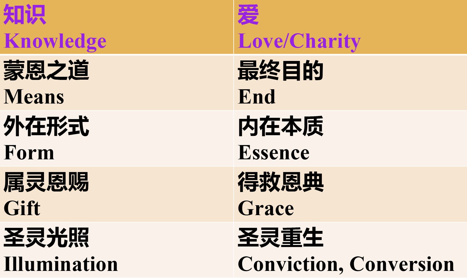 知识是蒙恩之道,不是目的。目的是要爱上帝,彼此相爱。但没有知识,也不可能做到爱上帝,彼此相爱。有了知识,也不能够停留在知识这里。知识是一个手段,是一个途径。而且知识也是一个外在的东西,是头脑和理性层面的。我可能知道很多,甚至知道很多爱的真理,但是不见得有爱的能力,有爱的生命。