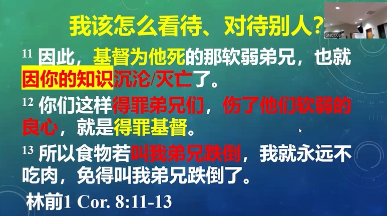 这就关乎我们怎么看待和对待别人,其他的基督徒在你眼里面是什么样的位置。我们一般都是把自己看得很高、很重要,但圣经让我们把别人看得很高、很重要。这样的人,是基督为他死了,我们看到别的基督徒,我们要想到:基督为这个人死了,我如果得罪他,就是得罪谁啊?就是得罪基督。这是我们怎么看待别人。