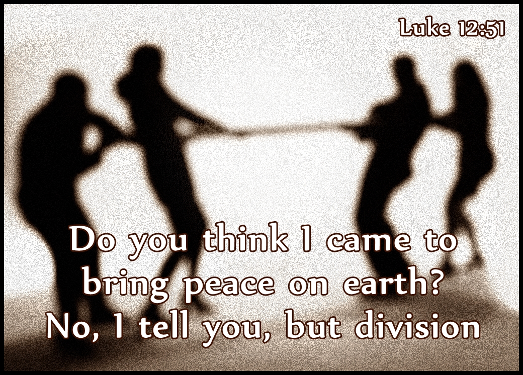 我们知道主耶稣是和平之君(赛9:6),可是主耶稣却又说“你们以为我来,是叫地上太平吗?我告诉你们,不是,乃是叫人分争。从今以后,一家五个人将要分争,三个人和两个人相争,两个人和三个人相争。父亲和儿子相争,儿子和父亲相争。母亲和女儿相争,女儿和母亲相争。婆婆和媳妇相争,媳妇和婆婆相争。”(路12:51–53)耶稣的到来,却在世上甚至家庭中带来了纷争!不错,这里的纷争是为了信仰与真理的缘故,那么,因为一场大选造成纷争,甚至是基督徒之间的纷争,又是为何?