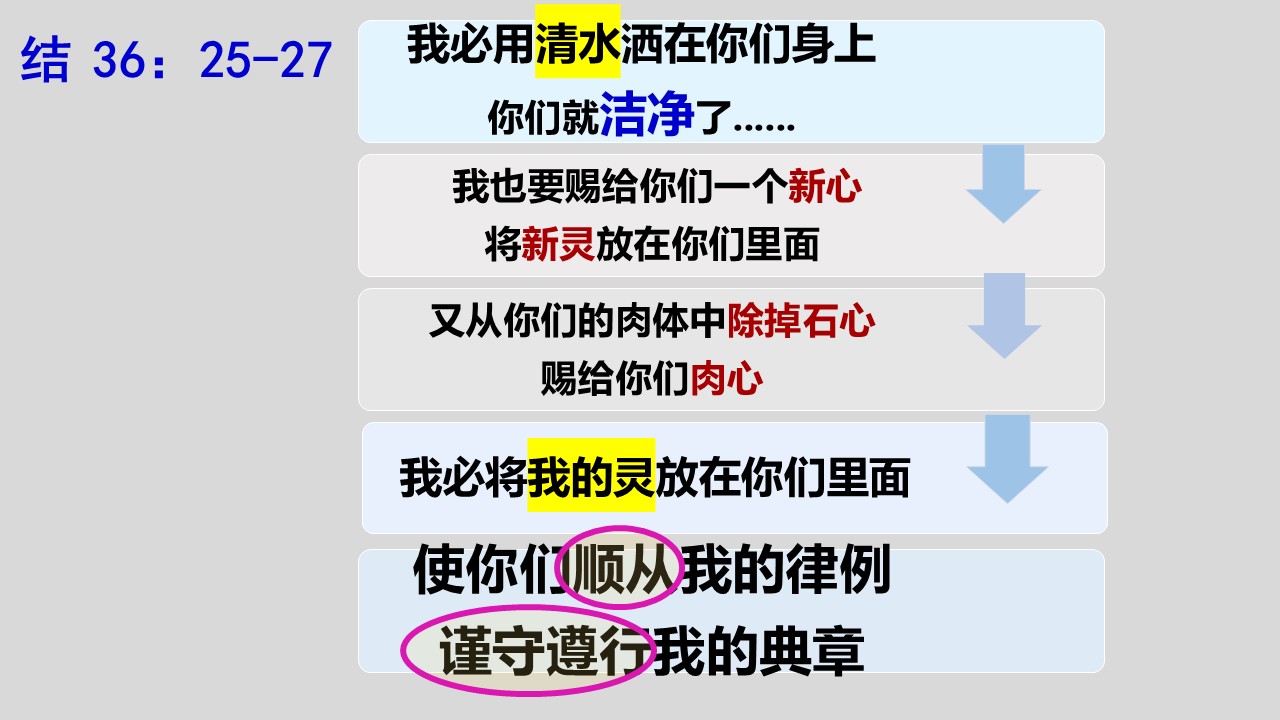 这里提到水和灵(就是上帝的灵),这里的水显然不是指受浸的水礼,而是圣灵除掉人内心的污秽的洁净工作。洁净人心是圣灵重生人的大能。怎样洁净的呢?经文说神除掉人的石心。石心是指人内心那种悖逆神、不爱神,对神的心意像石头那样无动于衷的状态。同时赐给人新心,新灵,肉心。这里的新心、新灵、肉心指的都是同一件事,是指人里面那颗顺服神、取悦神、爱神的心。神是透过除掉人的石心,赐给人肉心来洁净人心的。同时,神还把祂的灵放在这新造的生命里面。