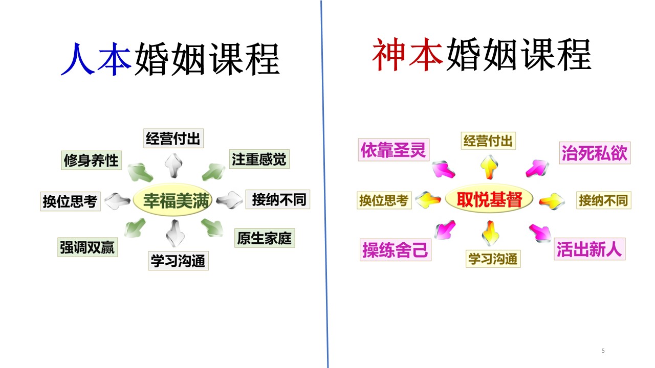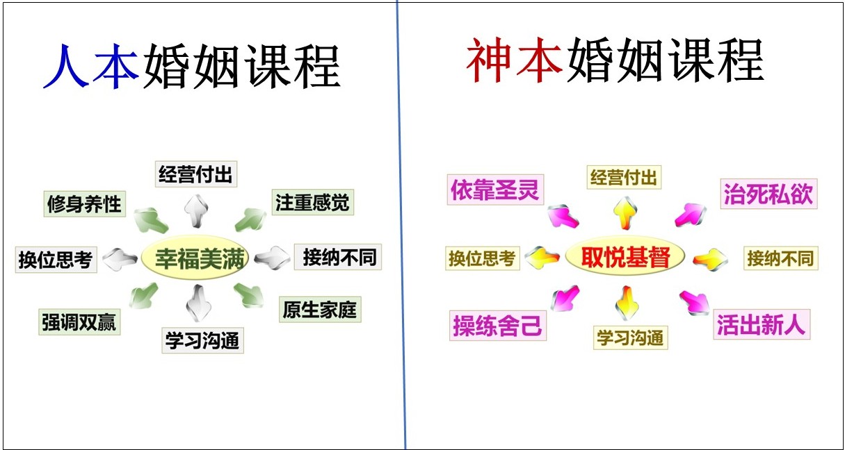 两者不同之处正是神本和人本的分水岭。以圣经真理为根基的婚姻辅导课程致力于把人带回到神面前,与主建立关系,就此能活出讨神喜悦、荣耀神的人生目的和价值。它跟婚姻只是为了让自己快乐,为了取悦自己,荣耀自己是截然不同的。