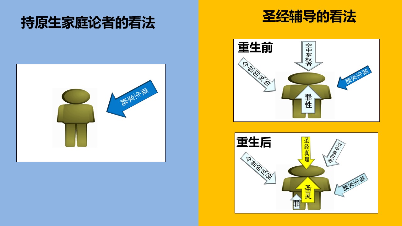 在开头说的原生家庭论的例子里,从圣经人论的核心真理我们会明白,原生家庭只是诸多影响中的一个,人的问题是多重影响造成的,事实上,从小很穷的“原生家庭”乃是 “强化”了当事人想要借着钱多来让自己有骄傲的本钱的欲望。由于诊断不同(对原生家庭的看法不同),那么,开出来的药方(带领人的方向)也跟着不同。不同于先前原生家庭决定论者,圣经辅导员会以在基督里的价值来勉励这位作丈夫的:“人生的价值不在于拥有多少钱财,而是在于基督里被神宣告为义,过去不明白真理的时候,我们随从了世界,以金钱来衡量一个人的价值的。但如今我们已经归向了基督,要脱下过去这些错误的价值信念。同时要靠圣灵去治死内心想依靠金钱来让别人瞧得起的欲望。”要劝勉他单单以凡事讨主喜悦作为行事为人的动机,要按神的心意来爱妻子,供应妻子各方面的需要,不单是物质,更是要顾念妻子情感上的需要。