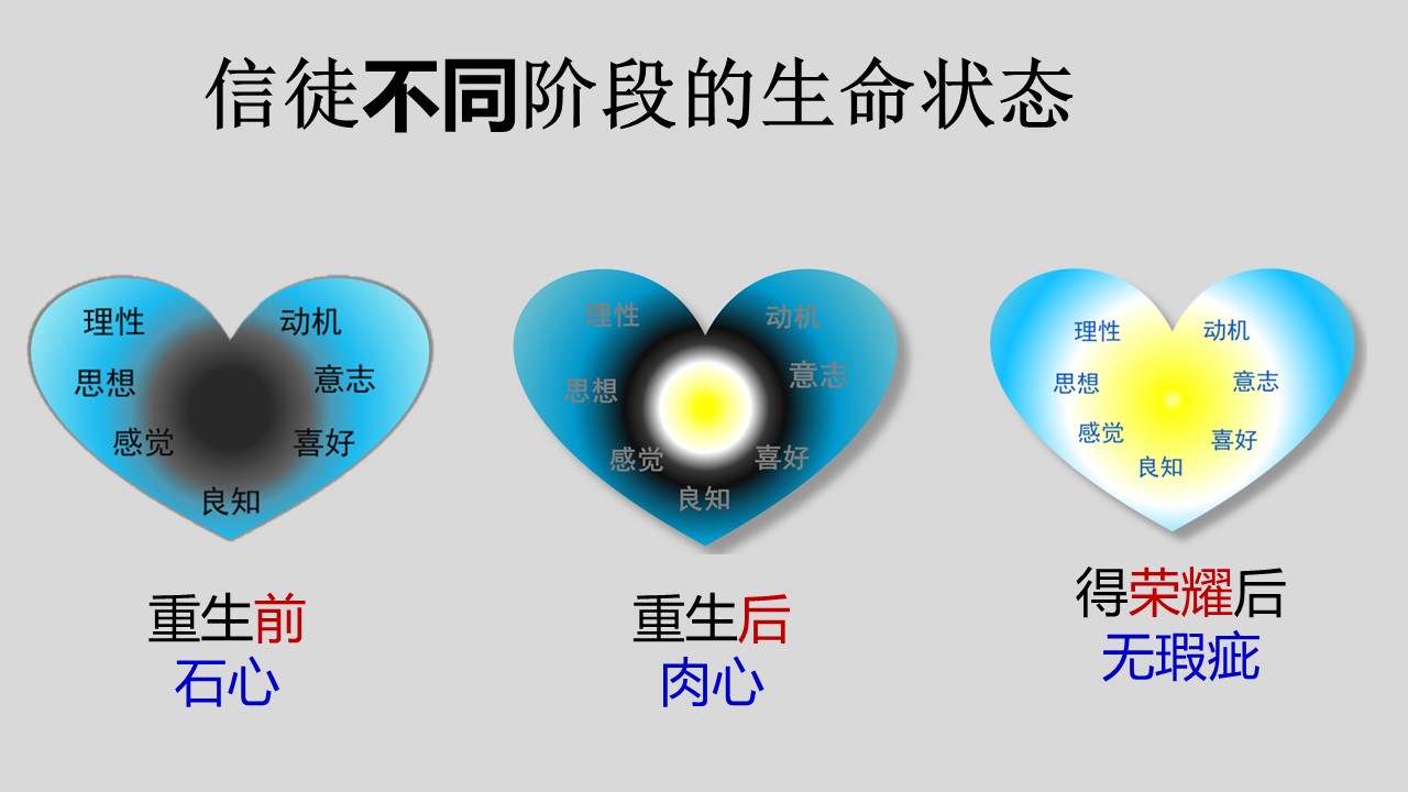 正如罗马书12:2说的,“不要效法这个世界,只要心意更新而变化”这种持续追求更新变化,直到我们见主面,脱离了罪的影响为止,也是圣经辅导所要做的,我们自己追求心意更新变化,并且进一步帮助其他弟兄姐妹也来追求心意更新而变化。等复活后,上帝会给我们一个完美的身体。届时,我们的灵魂也已经脱离了罪的影响。我们真正成为全然圣洁、没有瑕疵、无可责备的义人。这就是人在不同阶段的生命状态。这些真理,不但自己要清楚,也可以教导孩子们,让他们知道耶稣基督为我们做的是何等大的事情。我把这三张图片给我三岁半的外孙女, 解释给她听。她指着最后这张图片说,“我就是要这个心。”