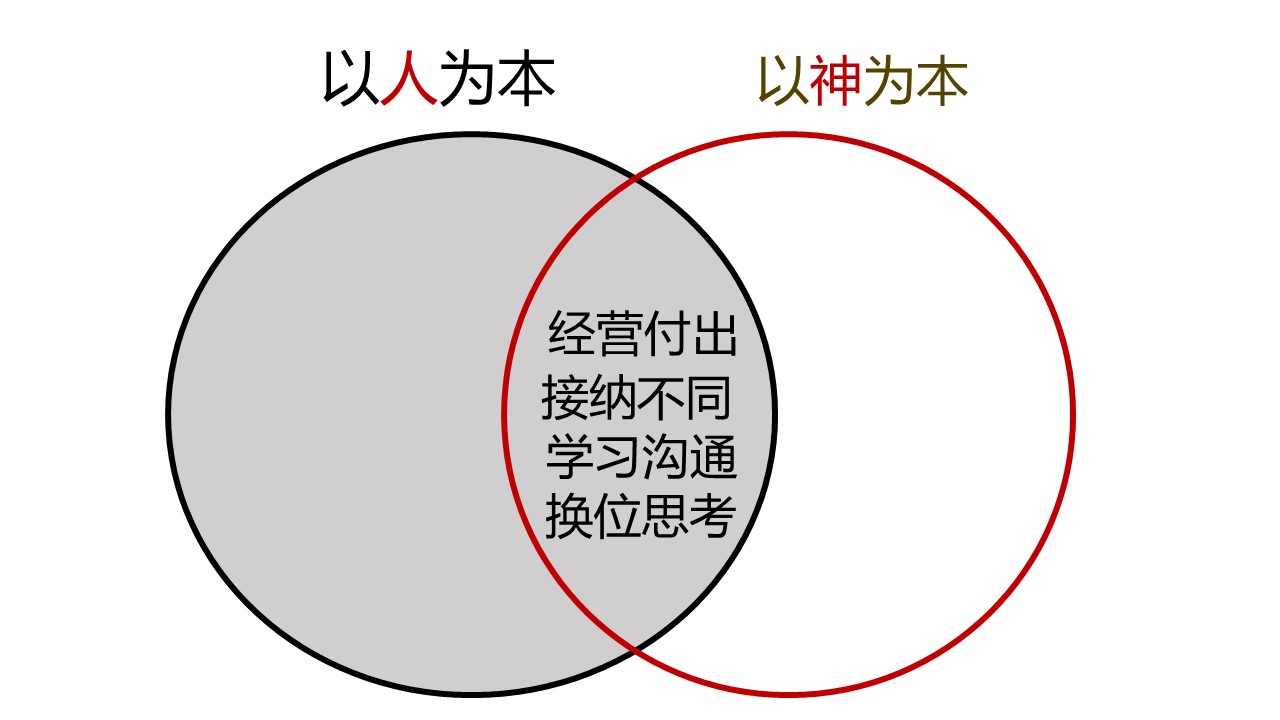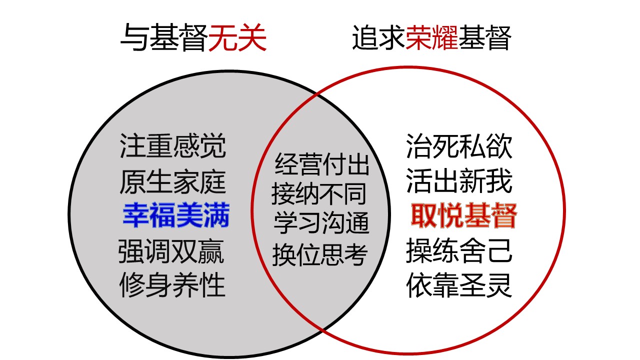 虽然这两套不同的婚姻课程(婚姻辅导)看来有某些共通点。比如:两者都会涉及到教导夫妻经营和付出、接纳彼此的不同、学习沟通和聆听的技巧、要有换位思考的同理心等等,像下图交叉重叠的部分: