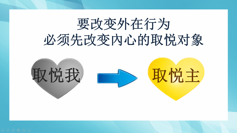 而取悦对象的改变对重生得救的人来说是生命核心的一个改变,也是整个人生追求方向的改变。因此,我们的辅导也是根基于这个方向,自己追求为讨主喜悦而活,并且引导别人也为讨主喜悦而活。而人本的辅导内容和方向则与讨主喜悦无关。