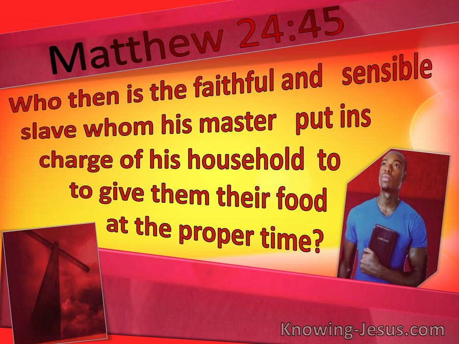 45 谁是忠心有见识的仆人,为主人所派,管理家里的人,按时分粮给他们呢?(太24:45)