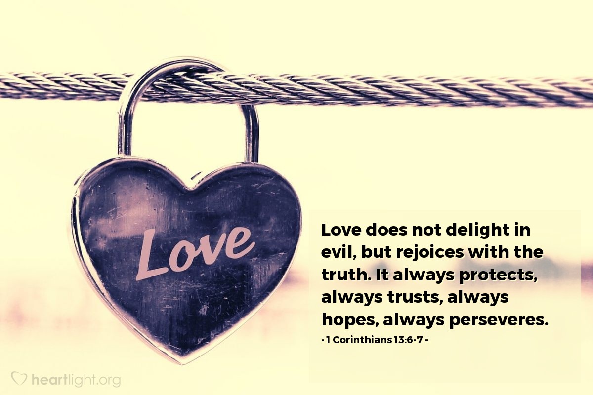 接下来,“不喜欢不义,只喜欢真理”(Love does not delight in injus­tice but rejoic­es with the truth)。前面说了,圣经的爱不是指人的感受,而是人的行动作为。那原则上来说,什么样的行为是爱的行为呢?这里的必要条件就是合乎真理的行为,义的行为,也就是上帝眼中对的行为。所以前面提到我对爱的定义特别加上“上帝眼中对的”行为:爱是利他而不是利己的,是上帝眼中对的行为。