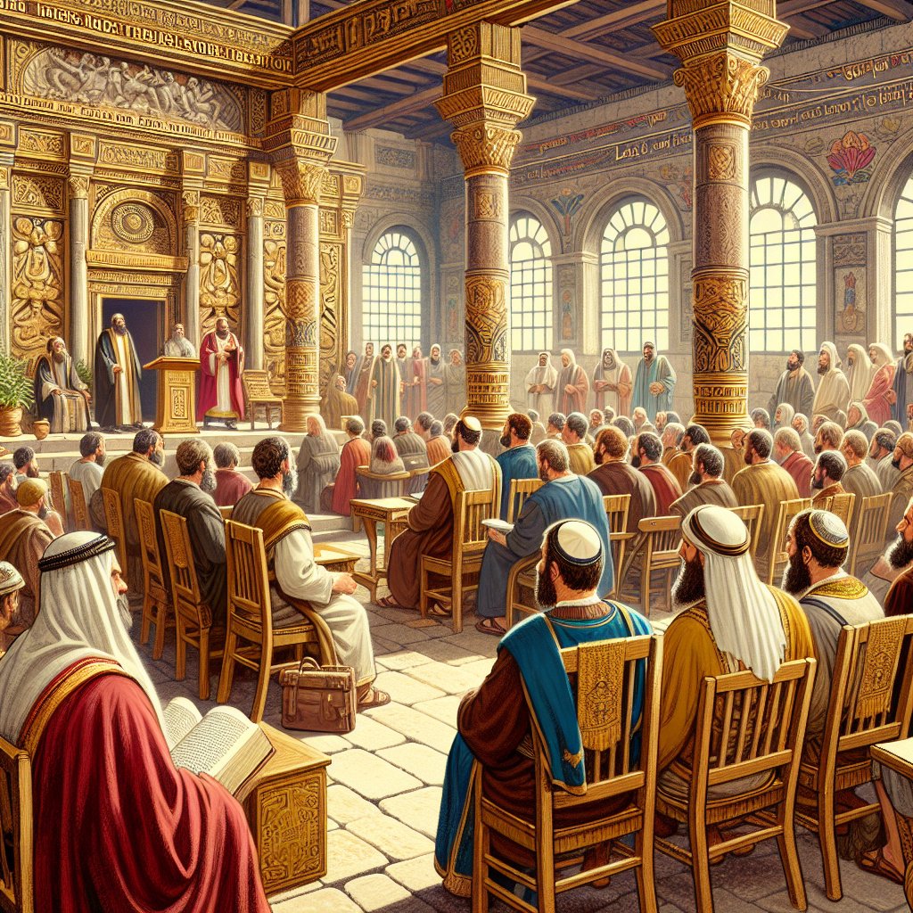 犹太会堂里的敬拜有一个固定程序,首先读申命记第六章的Shema passage: “以色列啊,你要听。耶和华我们神是独一的主。(Hear, O Israel: The LORD our God, the LORD is one.)…”(申6:4–9)然后是一段祷告,接下来是念律法和先知的书,最后是请人讲道,通常是管会堂的人邀请旅行的拉比讲道。保罗是曾经受过严谨训练的拉比,所以他被邀请讲道也是顺理成章。