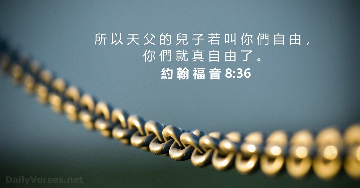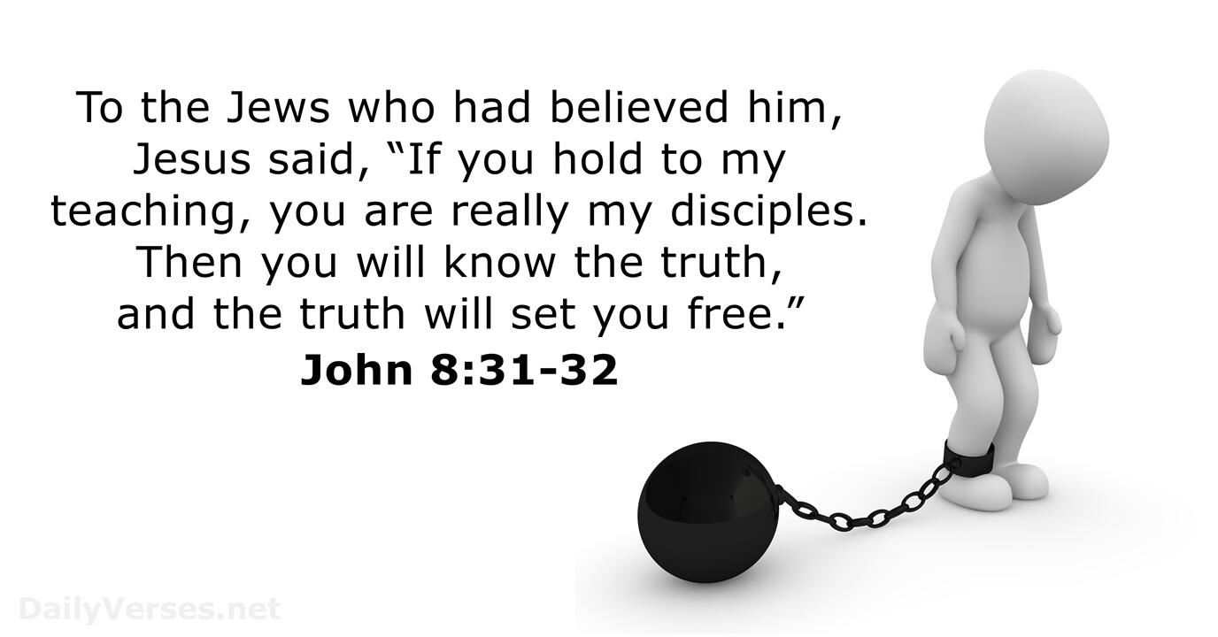 耶稣对信祂的犹太人说﹕“你们若常常遵守我的道,就真是我的门徒。你们必晓得真理,真理必叫你们得以自由。”他们回答说﹕“我们是亚伯拉罕的后裔,从来没有作过谁的奴仆。你怎么说,你们必得自由呢?”耶稣回答说﹕“我实实在在的告诉你们,所有犯罪的,就是罪的奴仆。奴仆不能永远住在家里,儿子是永远住在家里。所以天父的儿子若叫你们自由,你们就真自由了。”(约翰福音8:31–36)