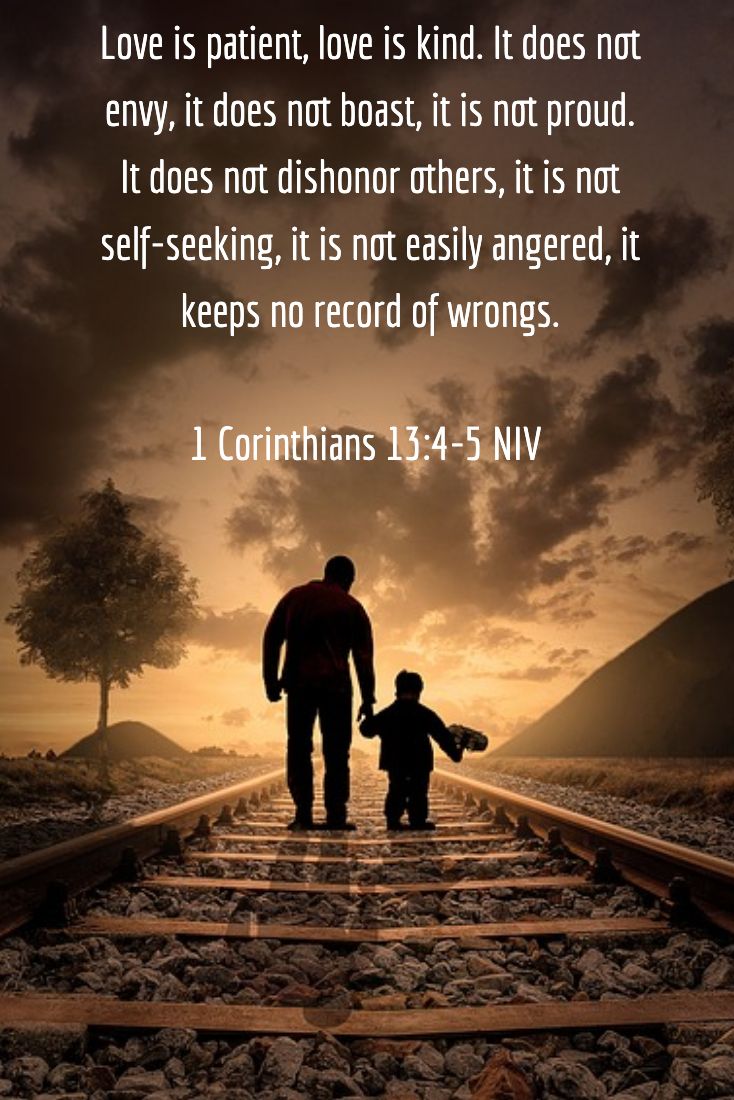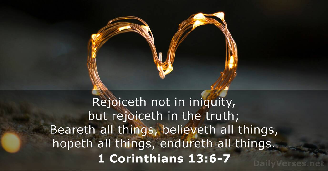 哥林多前书13:4–6 爱是不嫉妒,爱是不自夸,不张狂,不做害羞的事,不求自己的益处,不轻易发怒,不计算人的恶,不喜欢不义,只喜欢真理;