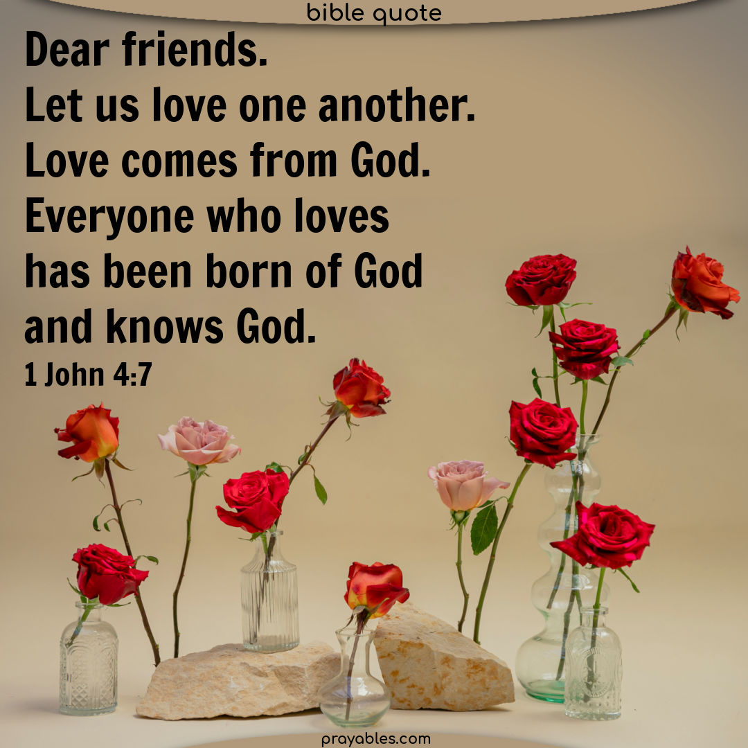 7亲爱的弟兄啊,我们应当彼此相爱,因为爱是从神来的。凡有爱心的,都是由神而生,并且认识神。8没有爱心的,就不认识神,因为神就是爱。