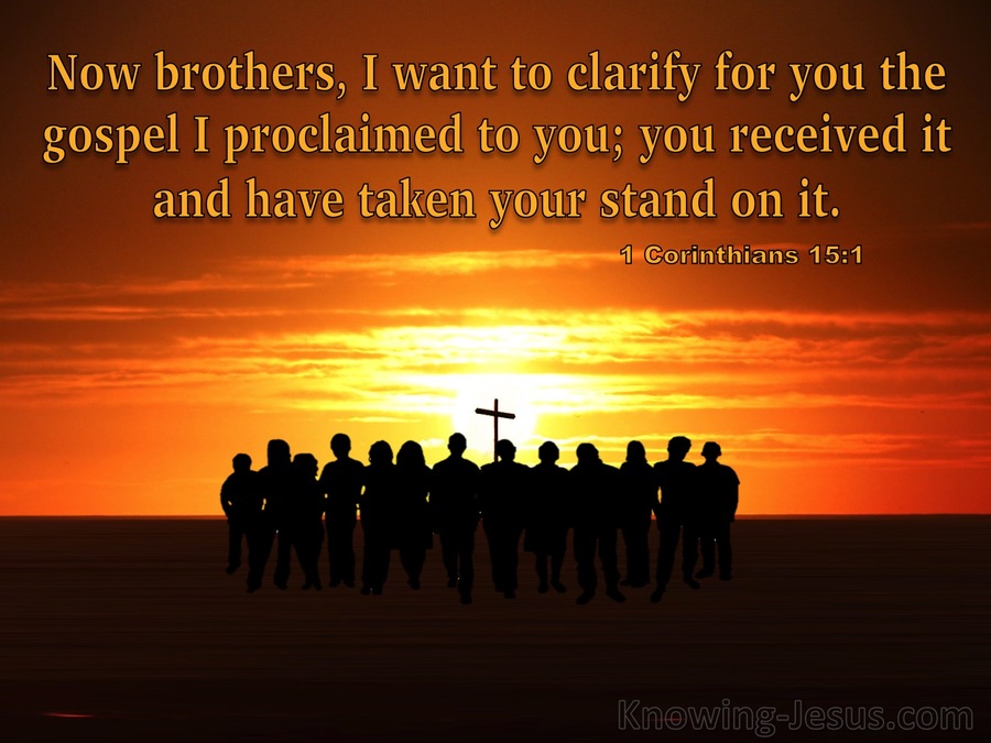 哥林多前书15:1弟兄们,我如今把先前所传给你们的福音,告诉你们知道。这福音你们也领受了,又靠着站立得住。