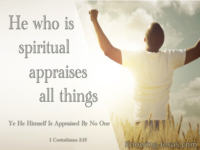 这段经文告诉我们,属灵的人能够知道神赐给我们的事情。属灵的人靠圣灵的指教,用属灵的话,解释神的事,讲说神的事。属灵的人能够看透万事,就是能够分辨世界的事情,人生的事情,什么样是神的旨意,什么不是神的旨意。看透这个字,英文这里翻译为discern,就是分辨的意思。属灵的人也能够看透或判断万事。但是没有人能够判断他,就是指属血气的人不能明白属灵的人所想的,所追求的,所看为宝贵的。
