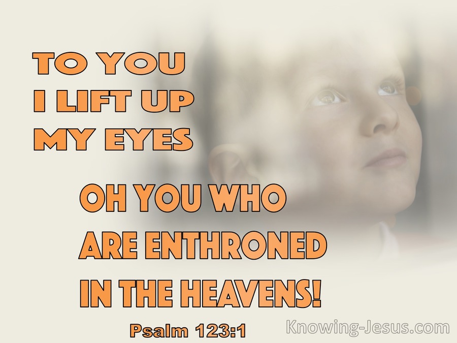 (上行之诗。) 坐在天上的主啊,我向你举目。看哪,仆人的眼睛怎样望主人的手,使女的眼睛怎样望主母的手,我们的眼睛也照样望耶和华我们的神,直到祂怜悯我们。耶和华啊,求你怜悯我们,怜悯我们!因为我们被藐视,已到极处。我们被那些安逸人的讥诮和骄傲人的藐视,已到极处。(诗123:1–4)
