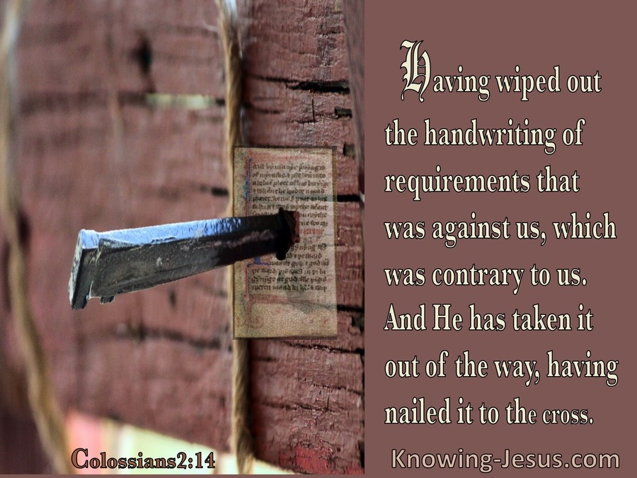 “涂抹、撤去、钉在十字架上”:指神因着耶稣在十字架上的牺牲,把我们的这些罪债完全取消了,把这些字据钉在十字架上,表明罪已得赦免,不再追讨。