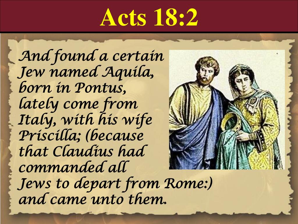 “遇见一个犹太人,名叫亚居拉,他生在本都。因为革老丢命犹太人都离开罗马,新近带着妻百基拉,从义大利来,保罗就投奔了他们。他们本是制造帐棚为业,保罗因与他们同业,就和他们同住作工。”(徒18:2–3)