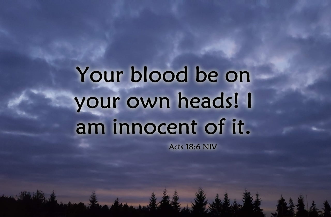 “他们既抗拒,毁谤,保罗就抖着衣裳说,你们的罪归到你们自己头上,与我无干,从今以后,我要往外邦人那里去。”(徒18:6)