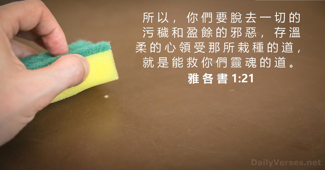 所以,你们要脱去一切的污秽和盈余的邪恶,存温柔的心领受那所栽种的道,就是能救你们灵魂的道。(雅各书1:21)