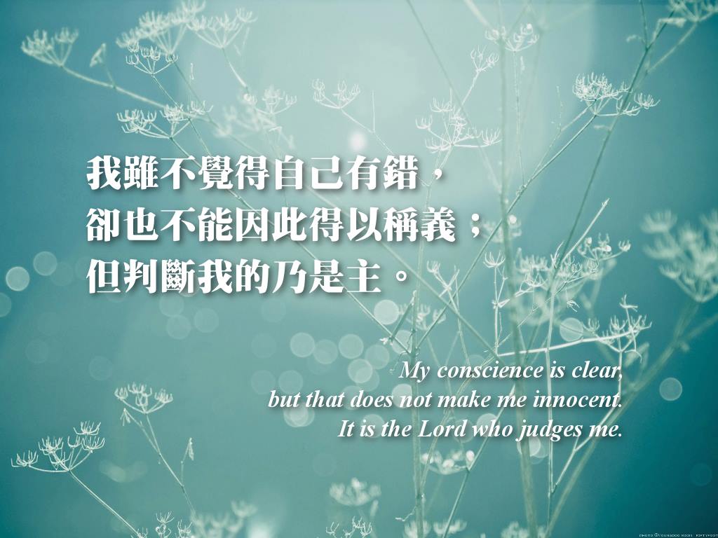 3我被你们论断,或被别人论断,我都以为极小的事,连我自己也不论断自己。4我虽不觉得自己有错,却也不能因此得以称义;但判断我的乃是主。5所以,时候未到,什么都不要论断,只等主来,祂要照出暗中的隐情,显明人心的意念。那时,各人要从神那里得着称赞。
