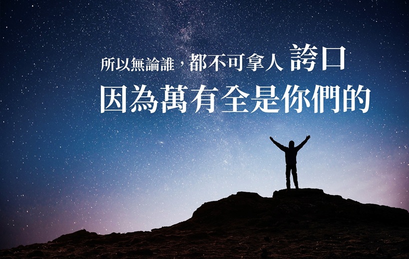 因为万有全是你们的,或保罗,或亚波罗,或彼得,或世界,或生,或死,或现在的事,或将来的事,全是你们的,并且你们是属基督的,基督又是属神的。就是夸口,当指向神夸口,指着主夸口。因为万有都是属于神的,而且神已经将万有服在基督脚下,使祂为教会作万有之首。我们属于基督的,万有也就是我们的。