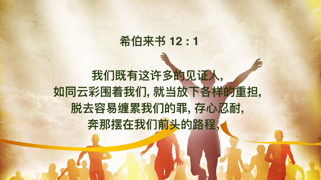 “我们既有这许多的见证人,如同云彩围着我们,就当放下各样的重担,脱去容易缠累我们的罪,存心忍耐,奔那摆在我们前头的路程,仰望为我们信心创始成终的耶稣,”( 来12:1–2) 。